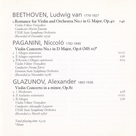 Viktor Tretyakov* - Beethoven*, Paganini*, Glazunov* - Romance For Violin And Orchestra No. 1 / Violin Concerto No. 1 / Violin Concerto (CD, Comp, Mono, RE, RM)