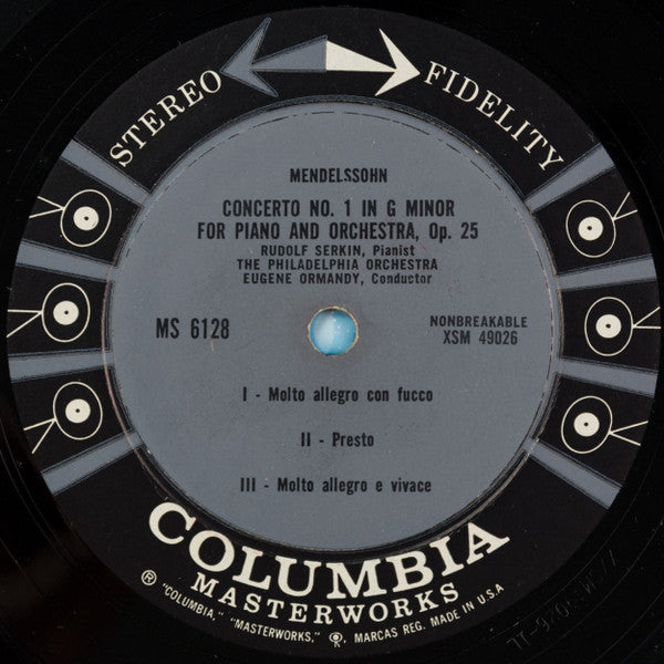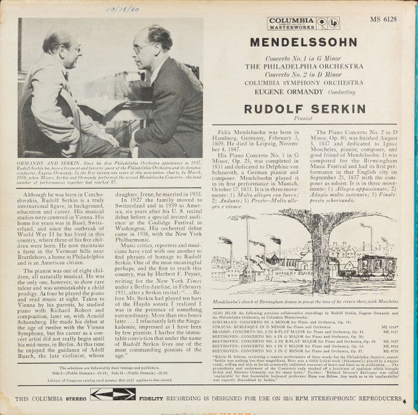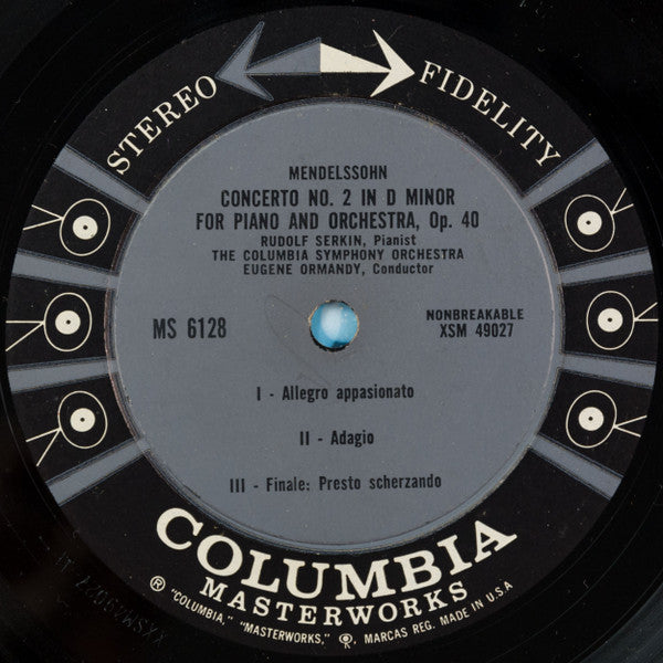 Rudolf Serkin, Felix Mendelssohn-Bartholdy, The Philadelphia Orchestra, Columbia Symphony Orchestra, Eugene Ormandy - Concierto n.º 1 en sol menor / Concierto n.º 2 en re menor (LP)