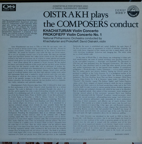 Aram Khatchaturian, Sergei Prokofiev – National Philharmonic Orchestra, David Oistrach - Oistrakh Plays - The Composers Conduct: Khachaturian Violin Concerto / Prokofieff Violin Concerto No.1 (LP, Comp, Quad)