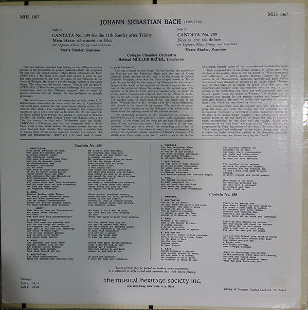 Side 1. Maria Stader - Cantata No. 199 For The 11th Sunday After Trinity Mein Herze Schwimmt Im Blut For Soprano, Oboe, Strings And Continuo 28:21