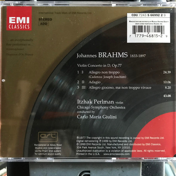 Johannes Brahms : Itzhak Perlman - Chicago Symphony Orchestra - Carlo Maria Giulini - Violin Concerto (CD, Album, Club, RE, RM)