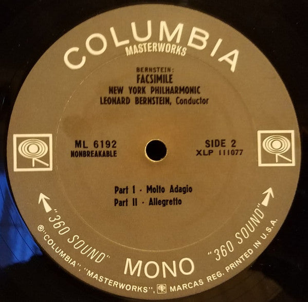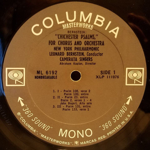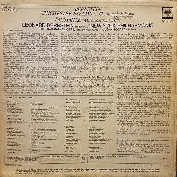 Leonard Bernstein - Leonard Bernstein Conducting The New York Philharmonic, Camerata Singers, Abraham Kaplan, John Bogart - Chichester Psalms / Facsimile (LP, Album, Mono)