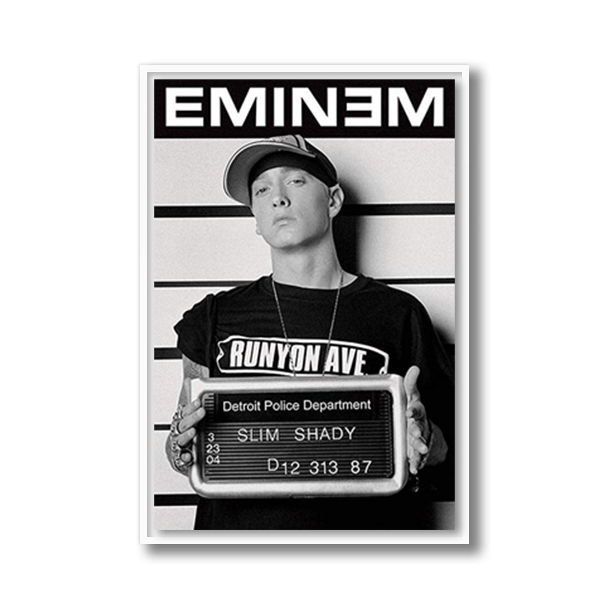 Eminem’s rebellious spirit shines in this iconic mugshot-style poster. The Slim Shady persona is on full display, embodying the raw energy and controversy that made him a hip-hop legend.