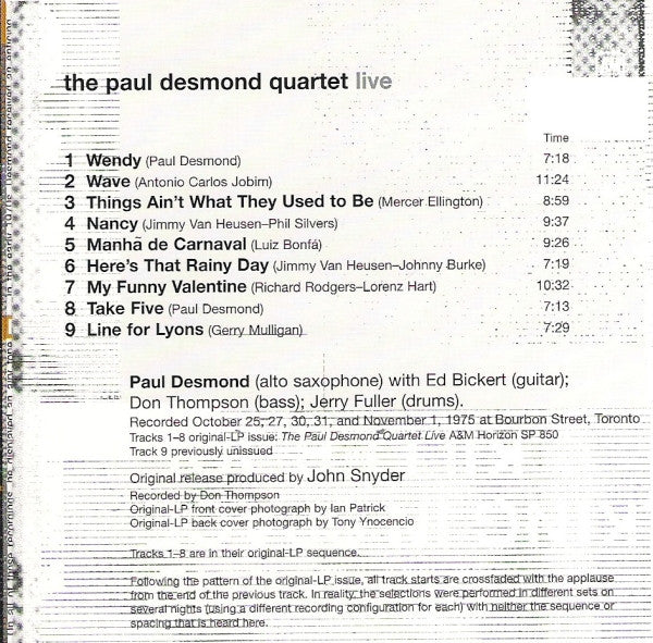 The Paul Desmond Quartet - Live (CD, Album, RE)